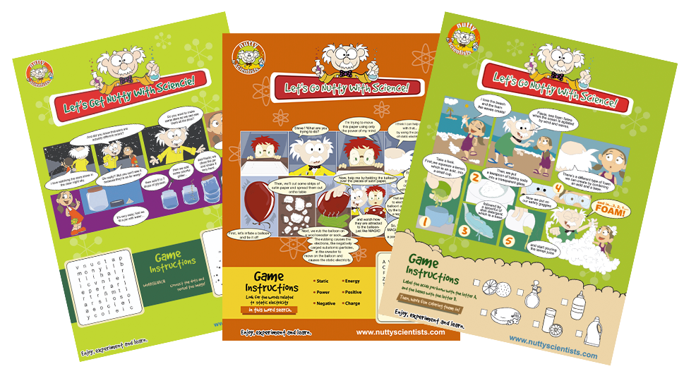 At Nutty Scientists we have our own comics. Through the stories, anecdotes, experiments and adventures of the Nutty Scientists gang, children can enter the world of science and experiment with the characters in an educational and fun way.